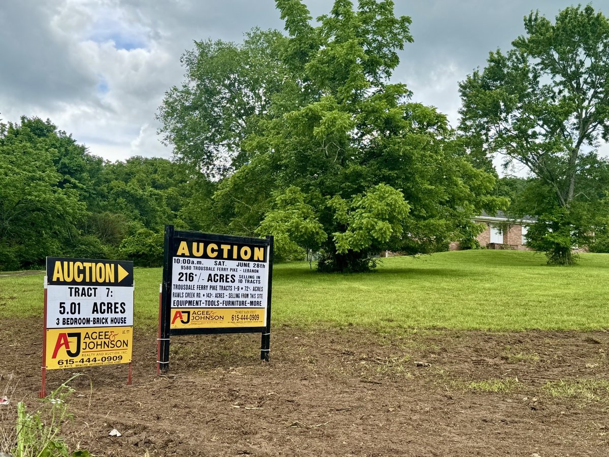 *** SELLING AT ABSOLUTE AUCTION Saturday June 28, 2025 @ 10am *** 216 Beautiful Acres -All Selling From One Location -- 9580 Trousdale Ferry Pike, Lebanon * 10 TRACTS * RANGING IN SIZE 5.01 TO 143.95 ACRES * Tracts 1-8 Front Trousdale Ferry Pike * Tracts 8 & 9 Front Commerce Rd * Plus! Rawls Creek Rd * Utility Water & Soils Tested (details sale date) Tract 1 -- 5.29 Acres * Tract 2 -- 5.18 Acres * Tract 3 -- 6.09 Acres * Tract 4 -- 5.95 Acres * Tract 5 -- 5.83 Acres * Tract 6 -- 6.99 Acres * Tract 7 -- 5.01 Acres Improved with 2088 sf 3 Bedroom 2 Full Bath Brick Home * Tract 8 -- 5.01 Acres Improved with 2272 sf 5 Bedroom Home Front Commerce Rd * Tract 9 -- 26.70 Acres Front Commerce Rd * Rawls Creek Rd, Gordonsville -- 143.95 Acres Front Rawls Creek Rd -- Sale Location 9580 Trousdale Ferry Pike* Contact Auctioneer Jay White for Further Information 615-308-4421. Beautiful Building Sites * Land Open for Inspection * Look at Your Convenience. Property Taxes May Change