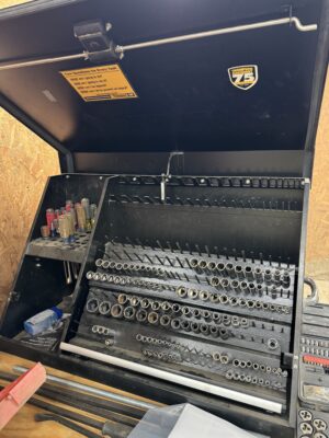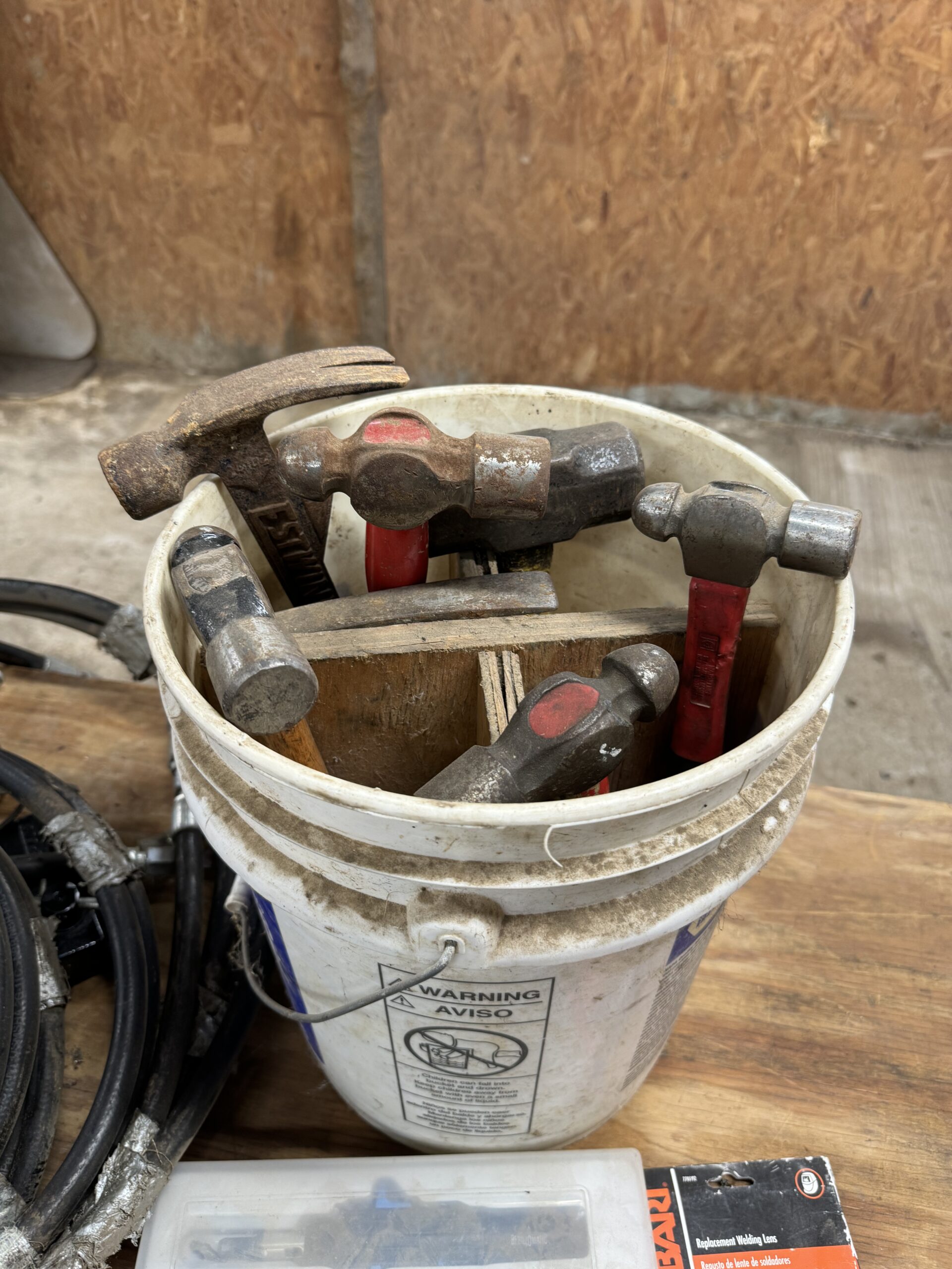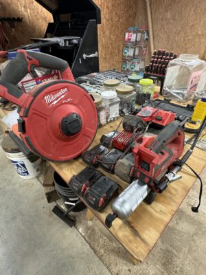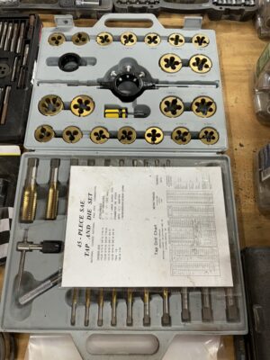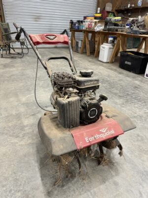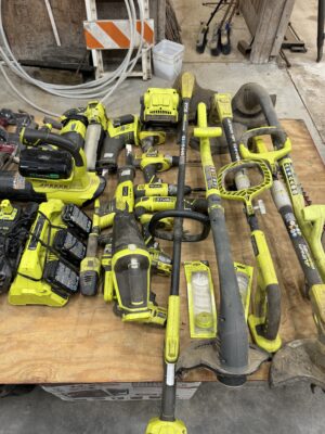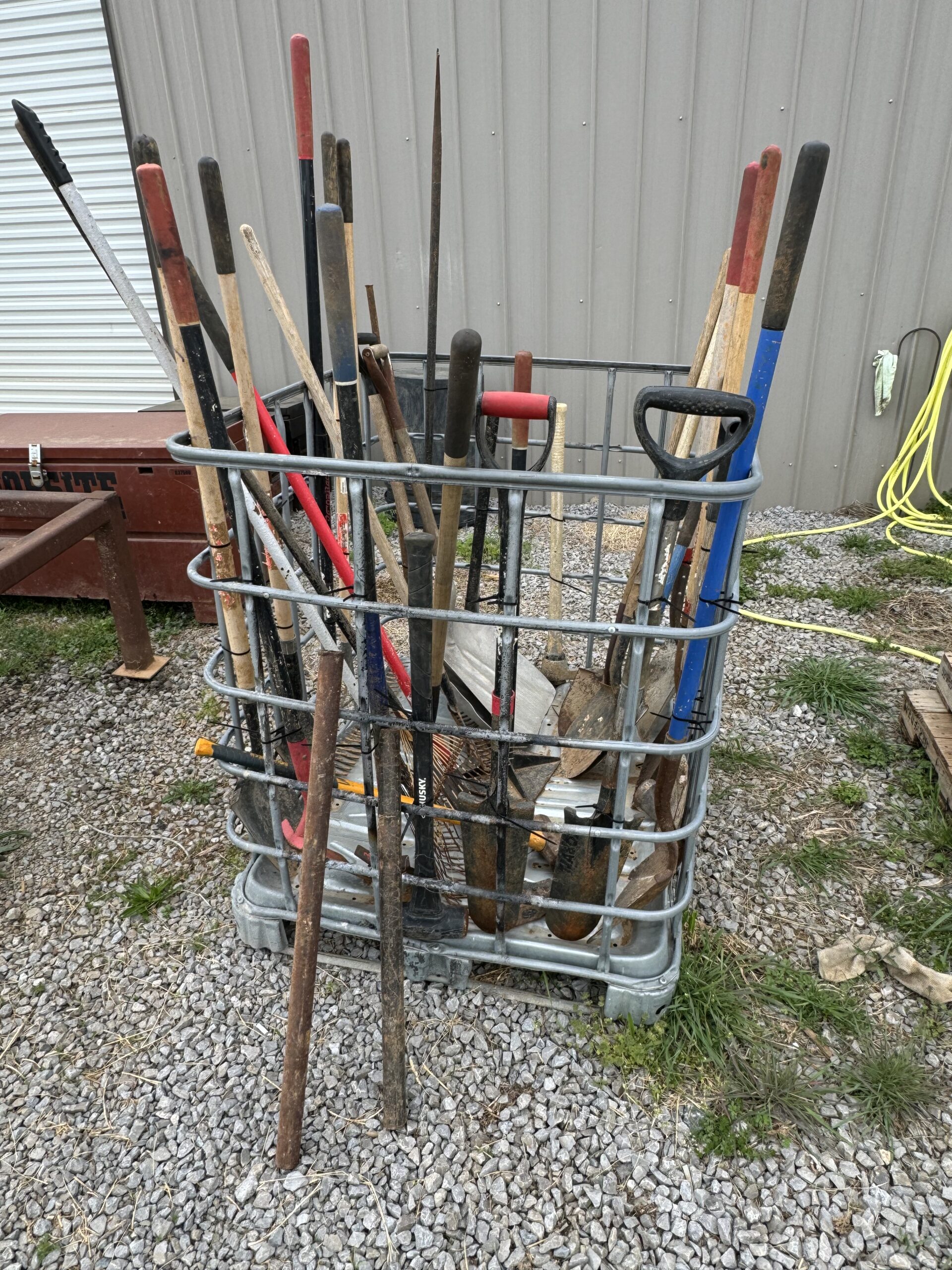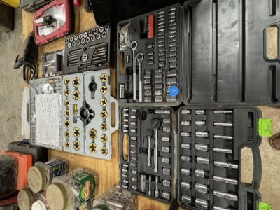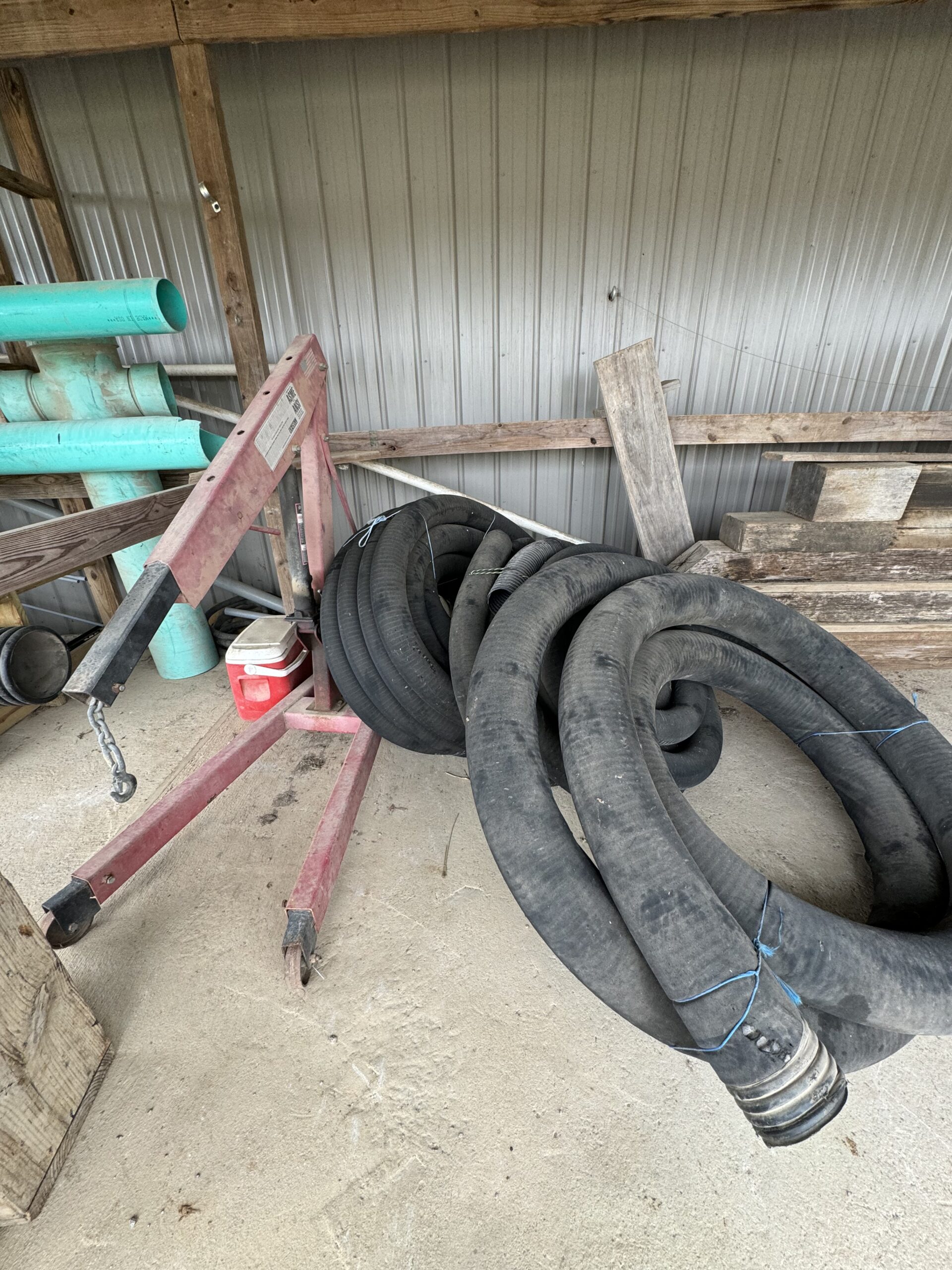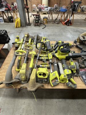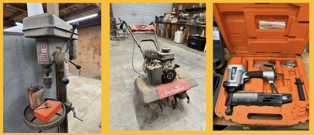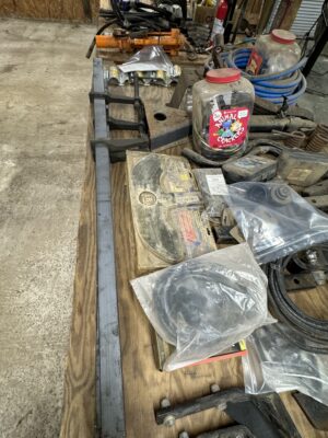 Engine Hoist • Hydraulic Hand Pump 3000 PSI • Pipe Bender • Hydraulic T-Post Driver • Pallet Jack • Versa Front Tyne Tiller • 12-Speed Drill Press • Milwaukee Fish Tape / Grease Gun / Chargers • Rap-A-Nail Air Gun / Nails • Stockade Fence Stapler Air Gun / Staples • Rigid Nail Gun • Misc Sockets / Wrenches / Screwdrivers • Montezuma Tool Box / Sockets • Ryobi Weed Eater / Hedge Trimmers / Drill / Sawzall • Lawn / Garden Tools • 1/2" Drill • Skil Saw • B&D Sawzall • MaxiVac Vacuum • Come-Along • Heavy Clamp • 6' Fiberglass Stepladder • 4-Leg Chain Sling • Rigid Shop Vac • Air Tank • Re-Max Backpack Sprayer • Hammers • Bolt Bin / Bolts • Road Cone Holders • Fasteners • Screws / Bolts / Etc • Tap & Die Sets • Air Hose • Tarps • Chains / Chain Binders • Plumbing Supplies • Electrical Supplies • Propane Heater • Castrol Transynd Hydraulic Fluid &Transmission Fluid • Assorted Caterpillar Skid Steer / Mini Excavator Replacement Teeth • Briggs & Stratton 11.5 Horizontal Engine • Storage Cabinets • Trailer Parts • Metal Cabinet • Drying Foam • Shrink Wrap Handles