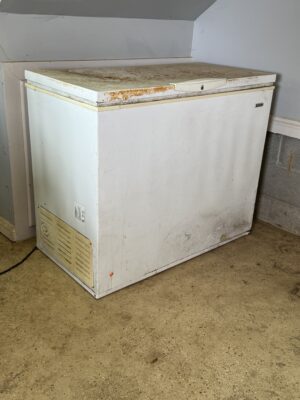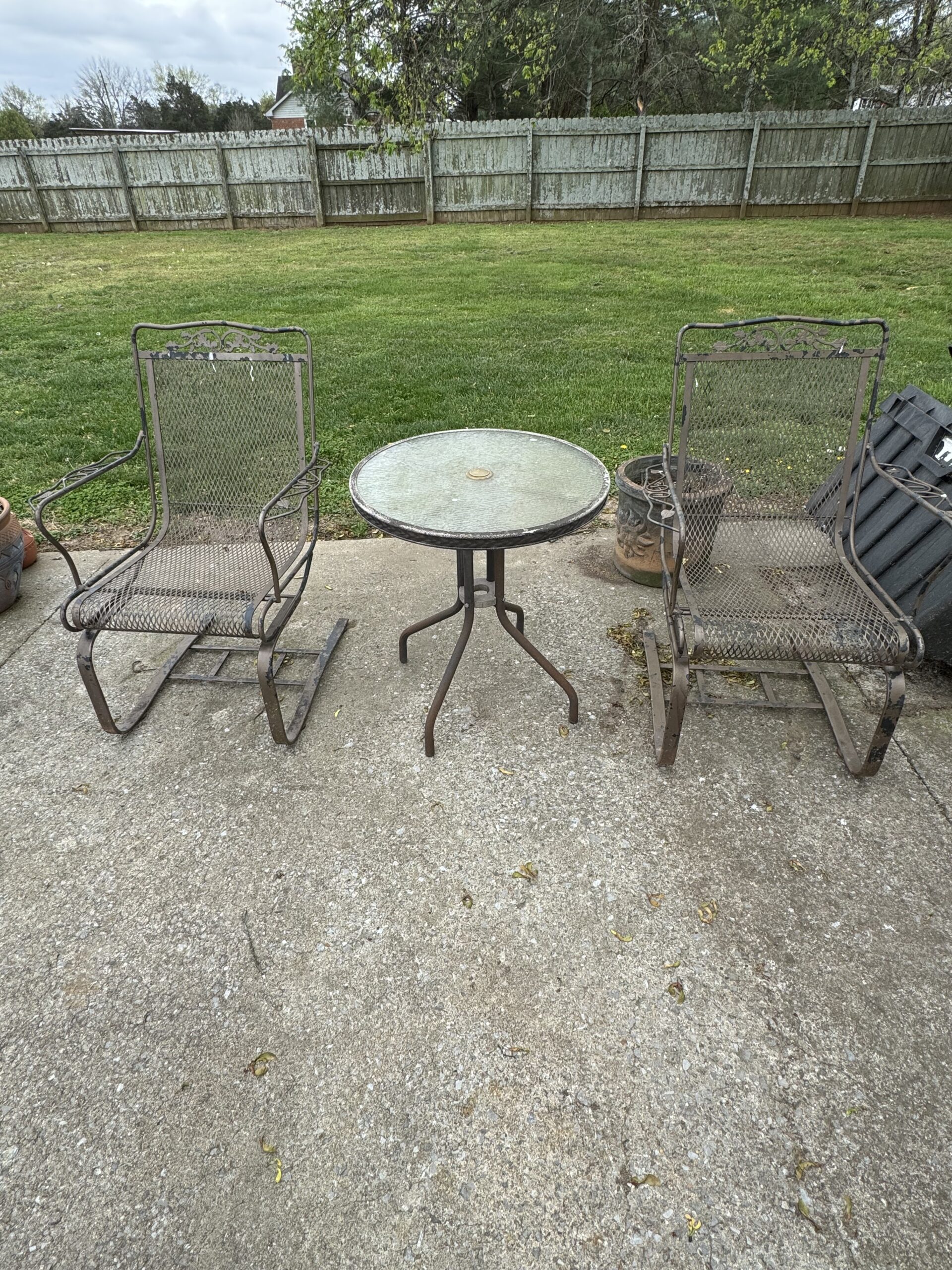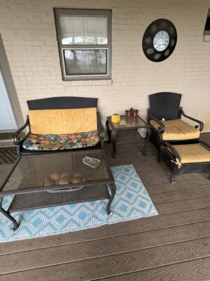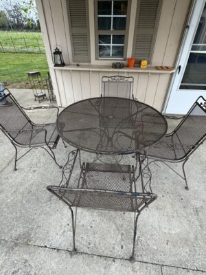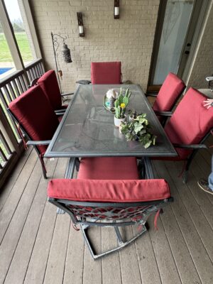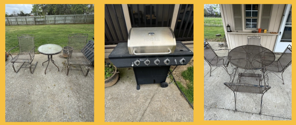 8-Pc Wicker Porch Set • Glass top Table w/ 6 Chairs Porch Set • Metal Retro Table w/ 2 Chairs • Metal Retro Table w/ 4 Chairs • 2 Patio Chairs • Chest Freezer • Pots • Pans • Cooking Utensils • Luggage • Dyson Vacuum • Tevis Tumblers • Flower Pots • Schwinn Bicycle • Golf Clubs • Dolls / Bears • Outside Storage Box - Resin • Totes • Coolers • Galvanized Trash Bins (2)
