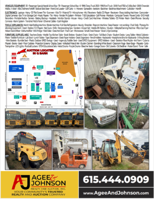 Laptops - Many • 32" Flat Screen TVs • Scanners • Vizio TV • Polaroid TV • Microphones • Mic / Receivers • Radio CD Player • Receivers • Sharp Adding Machines • Camcorder • Digital Cameras • Box TV on Storage Cart • Music Players • TVs - Many • Fender PA System • Printers • TI 83 Calculators • Cell Phones • Monitors • Computer Towers • Power Cords • DVD Multi Recorders • Portable Radios • Servers • Battery Backup • Headsets • Monitor Stands • Mouse - Many • Credit Card Machines • Wireless Tablets • 3D Printer -Resin • Desk Phones • Security Cameras • Alarm System • Trendnet Patch Panel • Ethernet Cables • Cash Register
