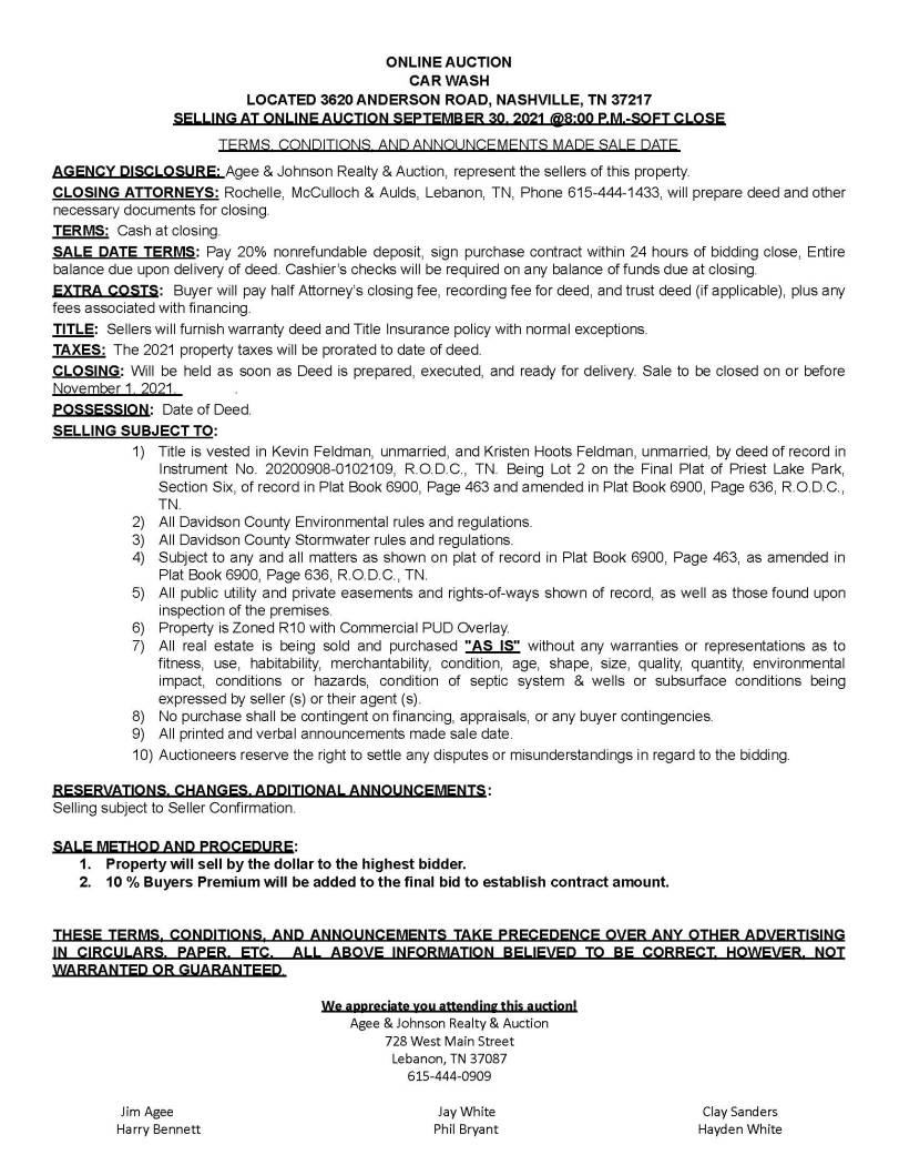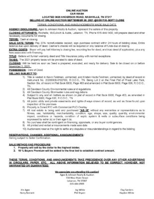 SALE TERMS: Sale subject to seller confirmation. 10% Buyer Premium will be added to final bid price to determine final contract sales price. A 20% non-refundable deposit of the total contract price & a signed purchase contract required within 24 hours after close of auction. Balance due on or before November 1, 2021.