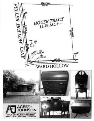 REAL ESTATE: 11.49 acres, corner of Parker Road and Fuller Hollow Road, improved with 1995 Fleetwood 24’x40’ double-wide home with 8’x40’ front porch. Home consists of living-dining area, kitchen with built-in cabinets, two bedrooms, two baths, utility room, central heat & air, detached carport with storage area, utility water and well on property. This property is move-in ready. Plus 11 acres for cattle, horses, other livestock and ride your ATV.