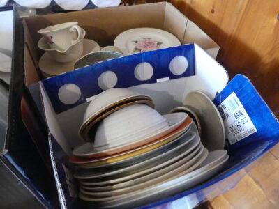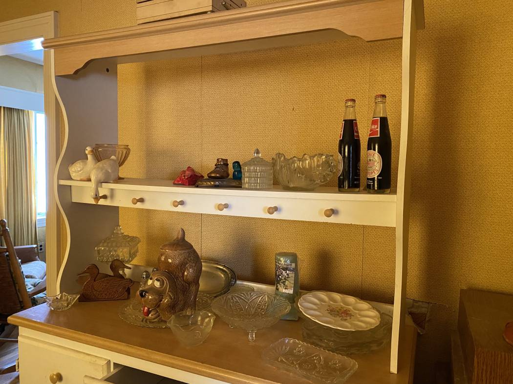 HOUSEHOLD ITEMS: Iron Skillets • Haviland China • Microwave • Electric Heater • Oil Lamps • Pitcher and Bowl • Flatware • Pots and Pans • Household Tools • Trash Can • Garden Hose • Window Fans • Tools