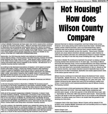 Wilson County continues to trend well above the National Trend above the Nashville - Middle TN trend. The median list price of homes in Wilson County was $359.9 in October 2019, trending up 2.8% year over year. The median listing price per square foot was $152 according to realtor.com.