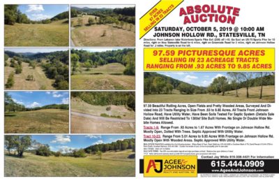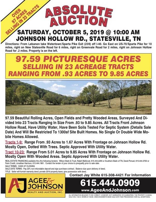 97.59 Beautiful Rolling Acres, Open Fields and Pretty Wooded Areas, Surveyed And Divided Into 23 Tracts Ranging In Size From .93 to 9.85 Acres. All Tracts Front Johnson Hollow Road, Have Utility Water, Have Been Soils Tested For Septic System (Details Sale Date) And Will Be Restricted To 1300sf Site Built Homes. No Single Or Double Wide Mobile Homes Allowed.