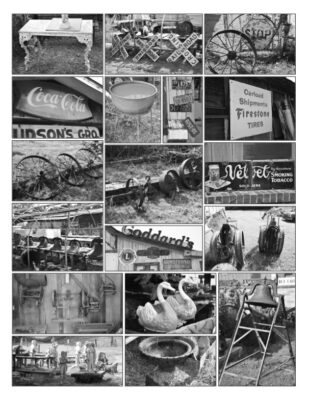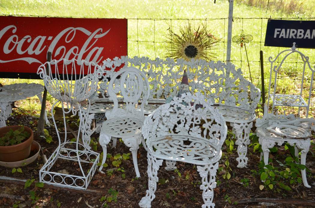 20 Tin Pie Safe, Antique Wooden Telephone Booth • Oak Rolltop Desk • Hat Tree • Wicker Porch Rockers, Setees, Tables • Porch Swing • "White Oak" Sewing Machine • Kitchen Cabinets • Trunks • School Desks • Oak Ice Box • Knock Down Wardrobe • Possum Belly Kitchen Cabinet • Curved Glass China Cabinet • Bed Frames • Tables • Wire Stool • Crocks & Stoneware • Iron Beds • Concrete Table & Benches • Antique Screen Doors