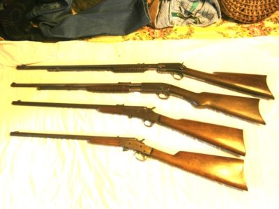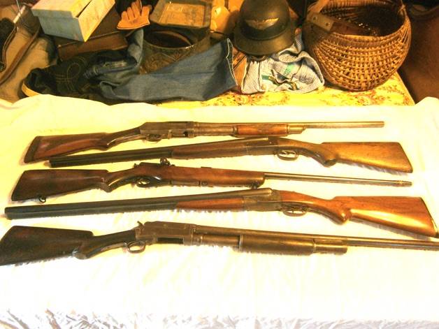 LONG GUNS : Marlin Mdl 19-S 12 Ga Pump • Remington Mdl.12-A22 Pump • J. Stevens Little Scout 22 Rifle • Remington Mdl 6 22 Single Shot • Remington Mdl 41 22 Bolt Action • Stevens Mdl 94 410 Single Shot • Eastern Arms 12 Ga Single Shot • Fox Mdl B20 Ga Double Barrel • N.R. Davis 12 Ga Double Barrel • Winchester 12 Ga Pump (ant) • Hopkins & Allen 16 Ga Single Shot • Springfield 84-C 22 Bolt Action • Westenfield Mdl 36 Bolt Action • J. Stevens 22 Single Shot ( Favorite) • BB Gun