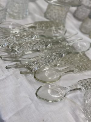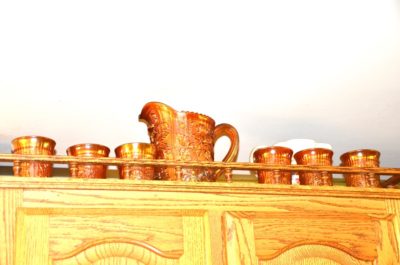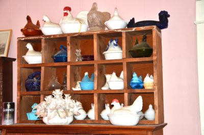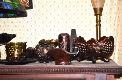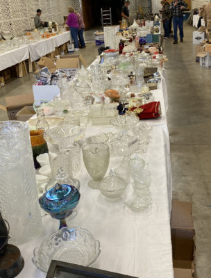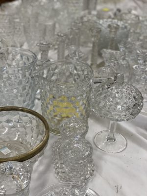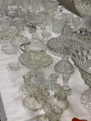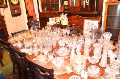 GLASSWARE : Hundreds Of Pieces Of American Fostoria Including: 3 Decanter Sets • Shrimp Dip Bowl • Lemonade Glass • 14" & 18" Punch Bowls w/ Stand & Underplate • 20" Underplate • Square & Bell Candlesticks • 2-16" Cupped Vases • Salters • Bitters Bottle • Butter Dishes • Candle Lamp W/ Chimney • Shot Glasses • Syrup Pitchers • Sugar Cube Bowl • Small & Large Decanters • Small & Large Top Hats • Round Cake Stand • Ice Bucket • Rose Dish • Square Wedding Bowl • (2) 8½" Swung Vases • 3-Ft Handled Basket • ½ Gallon Pitcher • Biscuit Jar • 2-Handled Bowl • 8" Plates • Tall Compote • 10½" Rectangle Tray • Salt & Pepper • Vinegar Cruets • Flared Vases • Handled Mugs • Jam Jar • Oval Plates • 3 Corner Bowl • Ketchup Bottle • Soup Bowls • Pomade Box • 16" Swung Vases • Butter Dish • Water & Tea Glasses • Goblets • Dessert Plates & Many, Many Other Pieces • Large Cut Glass Pieces Including: 19" Vase, Punch Bowl • Carnival Glass, Northwood, Others • Preserves Stands • Berry Bowls • Pressed Glass • Decorative Plates • Large Assortment of Hens On Nest • Glass Umbrella Holders • Bowl & Pitcher Sets • Beer Steins Collection • Mustache Cups • Shaving Mugs • Pitcher/Glasses Sets • Hull • Ruby Red Cut To Clear Cookie Jar • Bavaria Chocolate Set • Lance Cookie Jars • Shot Glasses • Avon Glass • Iris • Copper Luster • Wooden Butter Molds • Tin Biscuit Stacking Jars • GWTW Lamps • Table Lamps • Piano Lamps • Wooden French Wine Pitcher • Wooden Churns • Old Baskets • Dozens Of Oil Lamps • Blue Fruit Jars with Tops • Butter Churns • Wooden Bucket • 100+ Hand Stitched Quilts