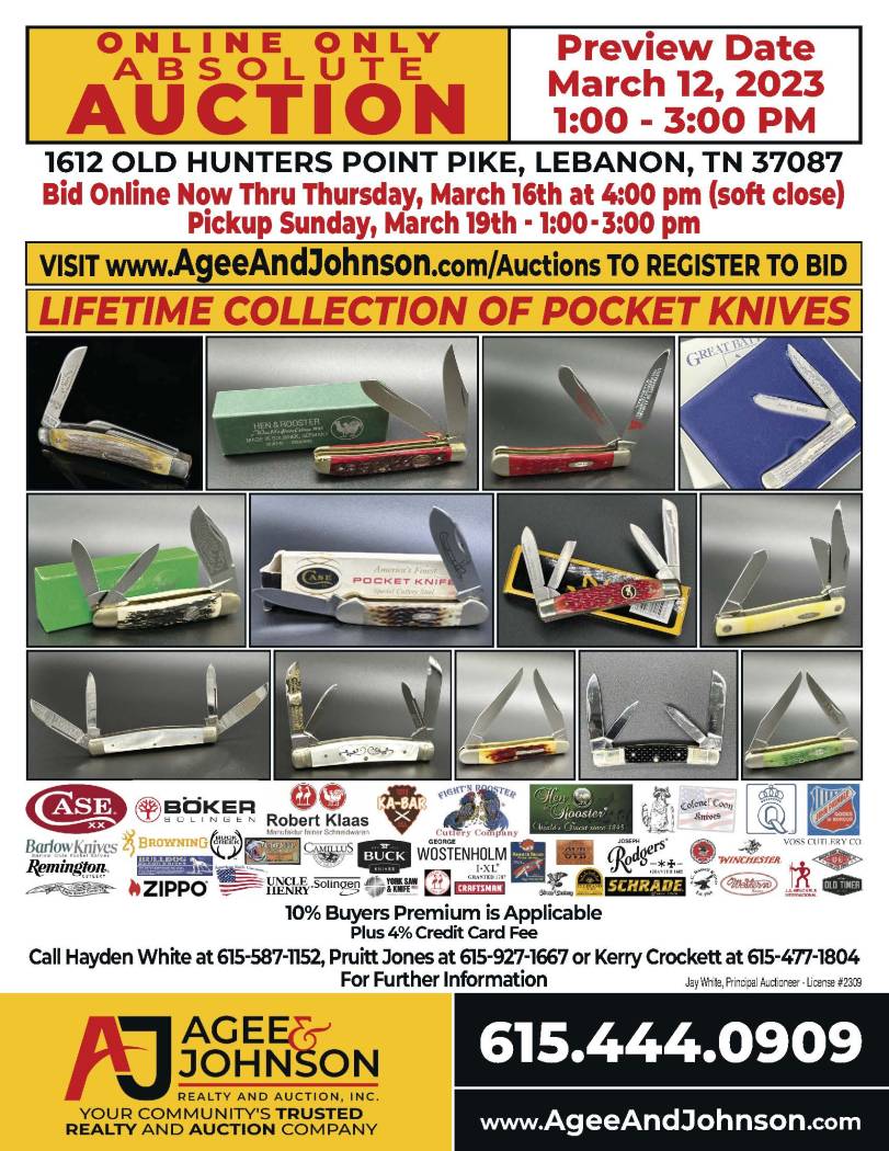 Bidding: register to bid @ www.AgeeAndJohnson.HiBid.com Preview: Sunday March 12, 2023 • 1pm-3pm cst. Preview Location: 1612 Old Hunters Point Pike • Lebanon TN