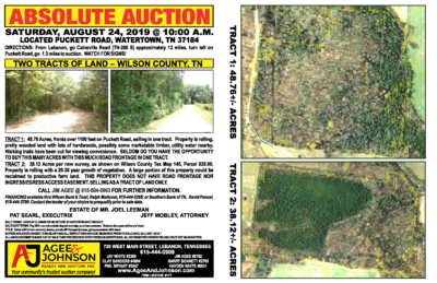 TRACT 2 : 38.12 Acres per new survey, as shown on Wilson County Tax Map 145, Parcel 028.00. Property is rolling with a 20-30 year growth of vegetation. A large portion of this property could be reclaimed to productive farm land. THIS PROPERTY DOES NOT HAVE ROAD FRONTAGE NOR INGRESS/EGRESS ACCESS EASEMENT. SELLING ASA TRACT OF LAND ONLY. CALL JIM AGEE@ 615-504-0963 FOR FURTHER INFORMATION. FINANCING available thru Wilson Bank & Trust, Ralph Mallicoat, 615-444-2265; or Southern Bank of TN, David Penuel, 615-444-3700. Contact the lender of your choice to prequaify prior to sale date.